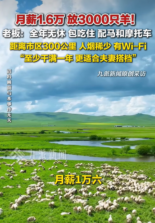 月薪1.6万元放3000只羊!4月23日,内蒙古锡林浩特的蒙原淳品左老板向记者介绍,工作地点位于内蒙古牧区,牧场面积三万多亩,需管近3000只羊。