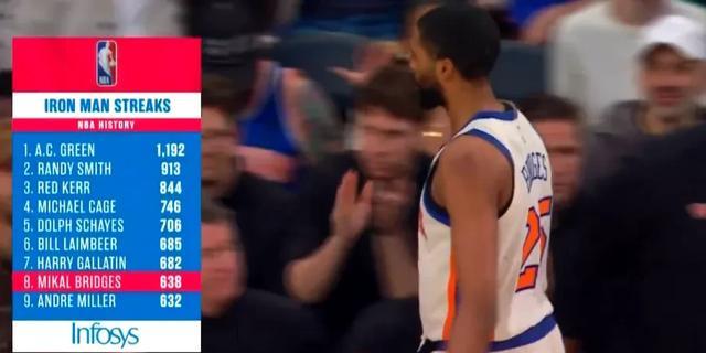 尼克斯大面积轮休,布里奇斯首节只打了23秒便下场休息,本赛季完成82场全勤。生涯至今,他一场都没休战过,连续出战638场,暂列NBA历史第8。黄蜂这边,三球和克尼佩尔争夺常规赛三分王,今天赛前三球比克尼佩尔少了3记。