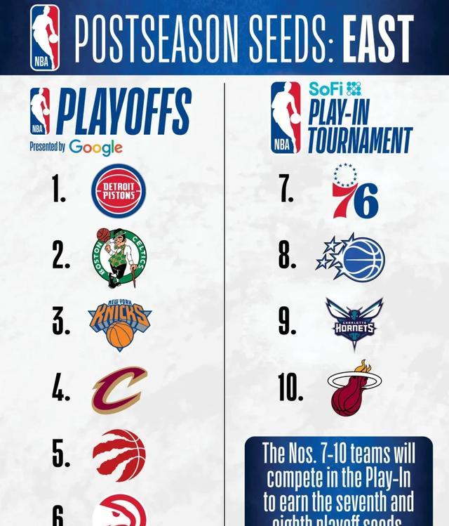 热火连续4年出战附加赛,今年真的不好打!东部排名正式确定:活塞、凯尔特人、尼克斯、骑士、猛龙、老鹰、76人、魔术、黄蜂、热火、雄鹿、公牛、篮网、步行者、奇才。季后赛首轮东部两组对决确定:骑士vs猛龙、尼克斯vs老鹰。