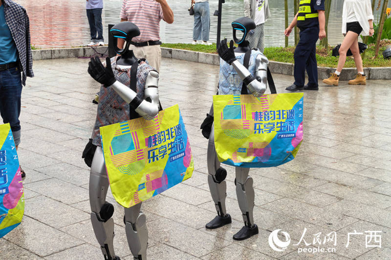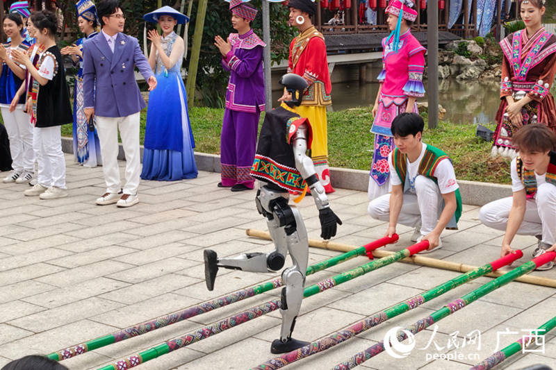 身穿精美壮锦的AI机器人向观众优雅招手,旁边的机械臂正熟练地煮着螺蛳粉,不远处,AI机器人跟着竹竿的节奏灵活跳跃。当AI走进广西三月三,眼前不是科幻片场,也不是科技展馆,而是触手可及的未来节日现场。